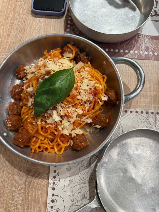 I nostri iconici spaghetti al sugo di pomodoro datterino, grana, basilico e polpette a scelta