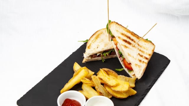 Bun, provola impanata e fritta, prosciutto cotto, tenders di pollo, salsa yogurt e rustica san carlo.