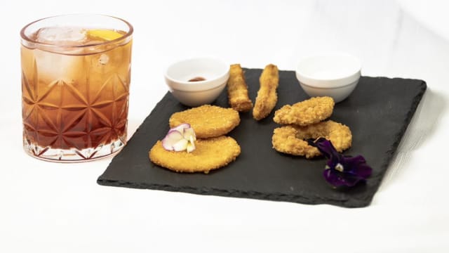 Striscioline di pollo, anelli cipolla e pollo, schiacciata patate e pollo, salse.