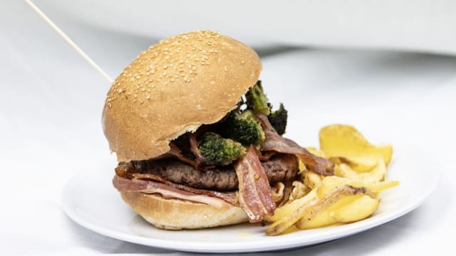 Bun, hamburger di scottona, insalata della chef, provola bianca, chips di melenzane, crocchettone di patate e maionese.