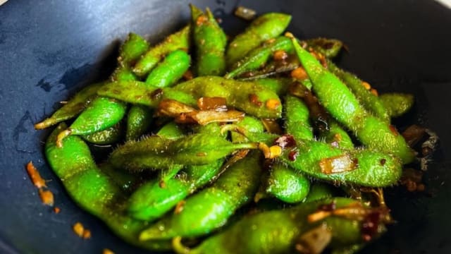 Soja verde,salteada com gengibre, cebola roxa e molho de soja.