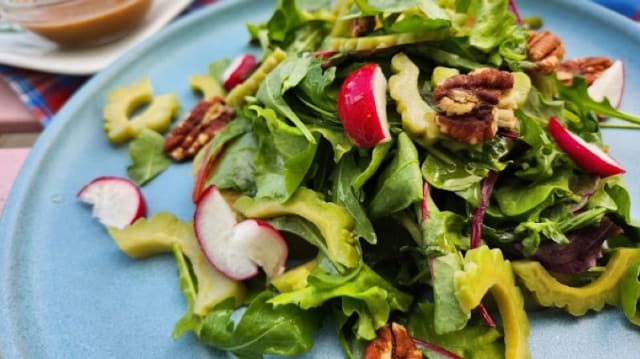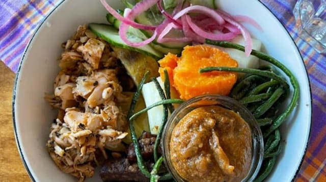 Masala potato and pumpkin* longbeans* chickpeas* aubergine mash*tomato hot sauce (on the side)