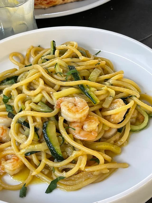 Focaccia bianca, zucchine, in uscita burrata, acciughe, limone grattugiato, olio evo