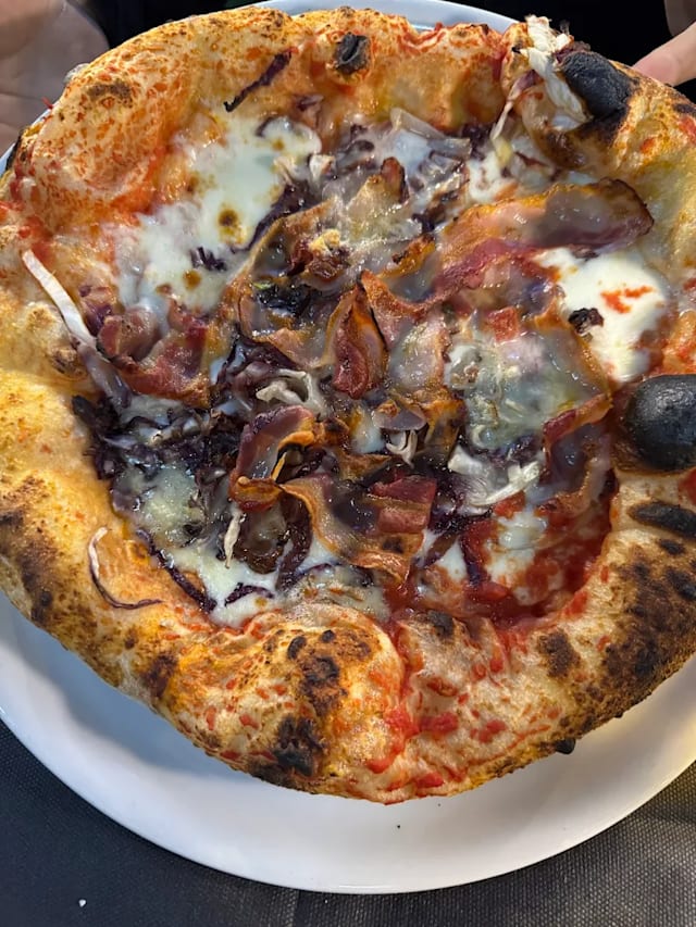 Pomodoro s. marzano, basilico, mozzarella fior di latte, cipolla rossa di tropea, salamin piccante, gorgonzola, olive taggiasche, olio evo