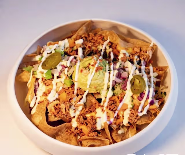 - Totopos de maíz, ternera, salsa de quesos, guacamole, jalapeños, crema agria, alioli, salsa mexicana y cebolla