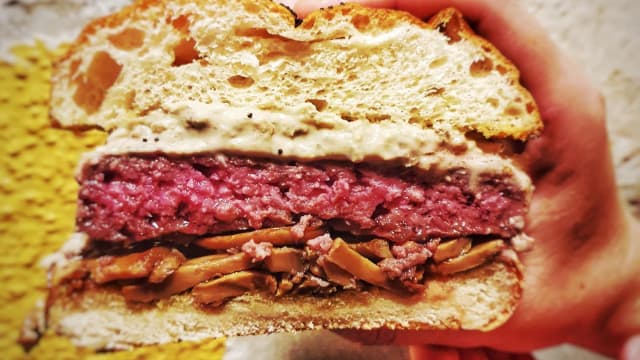 Vurger vegana crujiente de proteína vegetal 100%, con queso vegano, portobellos salteados con margarina al romero, mayonesa de trufa y polvo de frutos secos.
