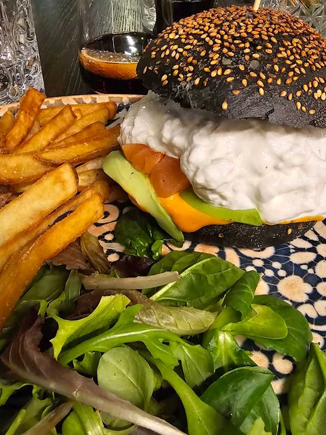 - Pane nero, tartare di salmone, stracciatella, avocado, maionese al basilico, servito con patatine fritte e lattuga