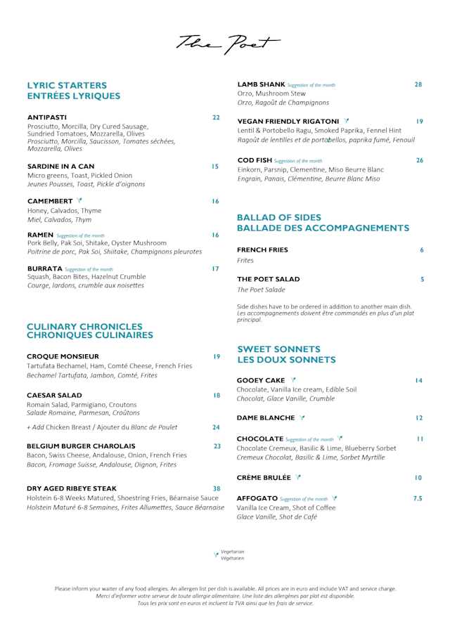 10/10We were visiting Brussels for a few days for the new year celebrations and wanted something a little different to your usual evening dinner, the poet was perfect for this. The 7 course meal allowed us to try several different dishes which were all cooked perfectly and extremely flavourful. Staff were very attentive and chatty as well. Overall we had a great experience and would highly recommend.