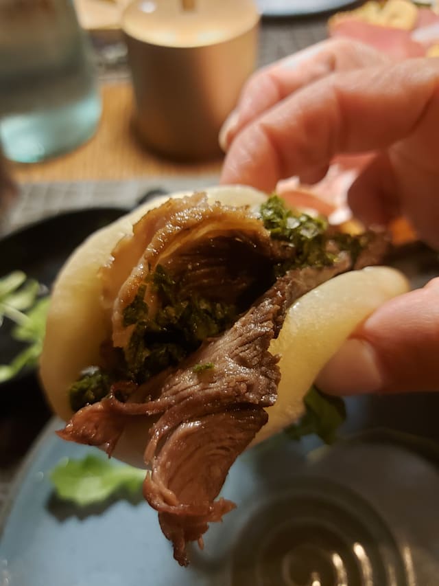 Bao cotto al Vapore farcito con Veli di Picanha Sakura cotta sotto sale, e glassato con salsa Chimichurri.
