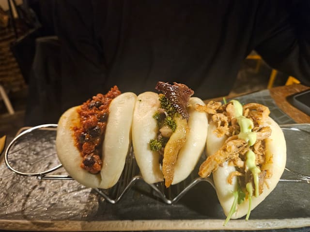Panino bao cotto al vapore farcito con chili di carne, leggermente piccante. Nb: la preparazione del chili ha bisogno di ore di cottura, pertanto è impossibile richiedere una versione non piccante fatta al momento.