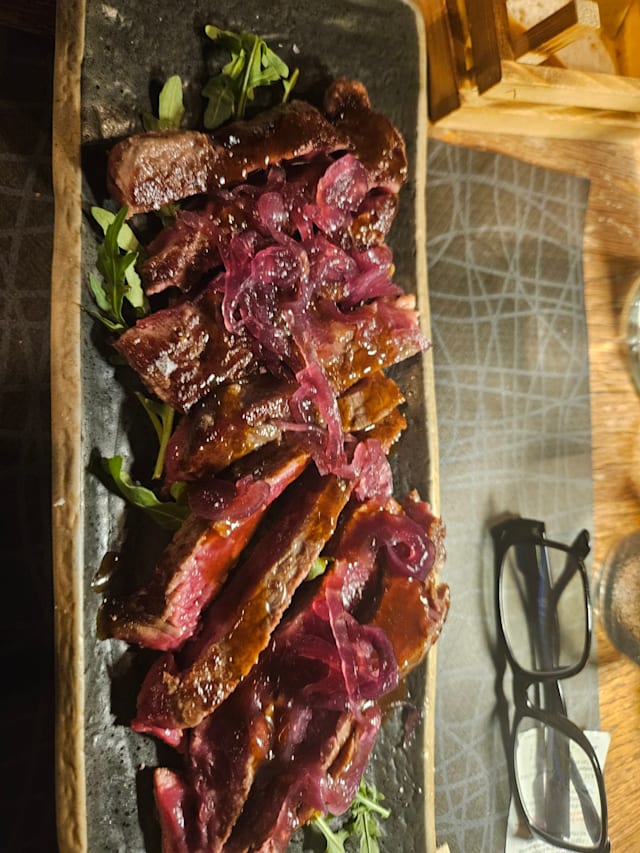 Tataki di manzo leggermente scottata, patate alla parisienne, su fondo bruno e soia, contornata da cipolla rossa ai lamponi