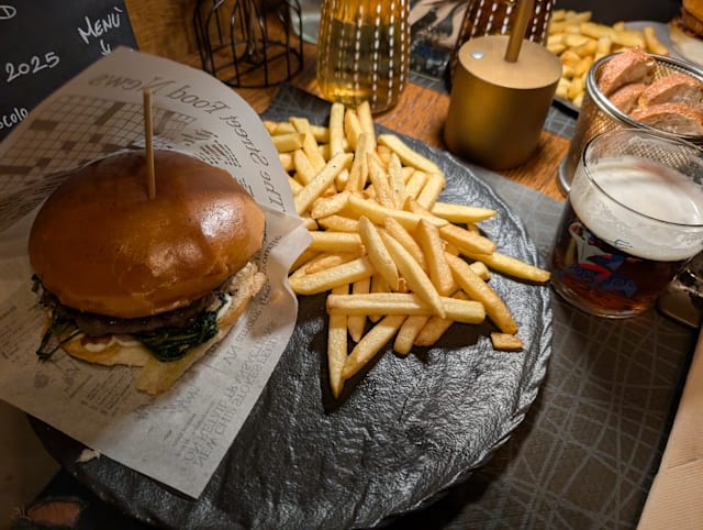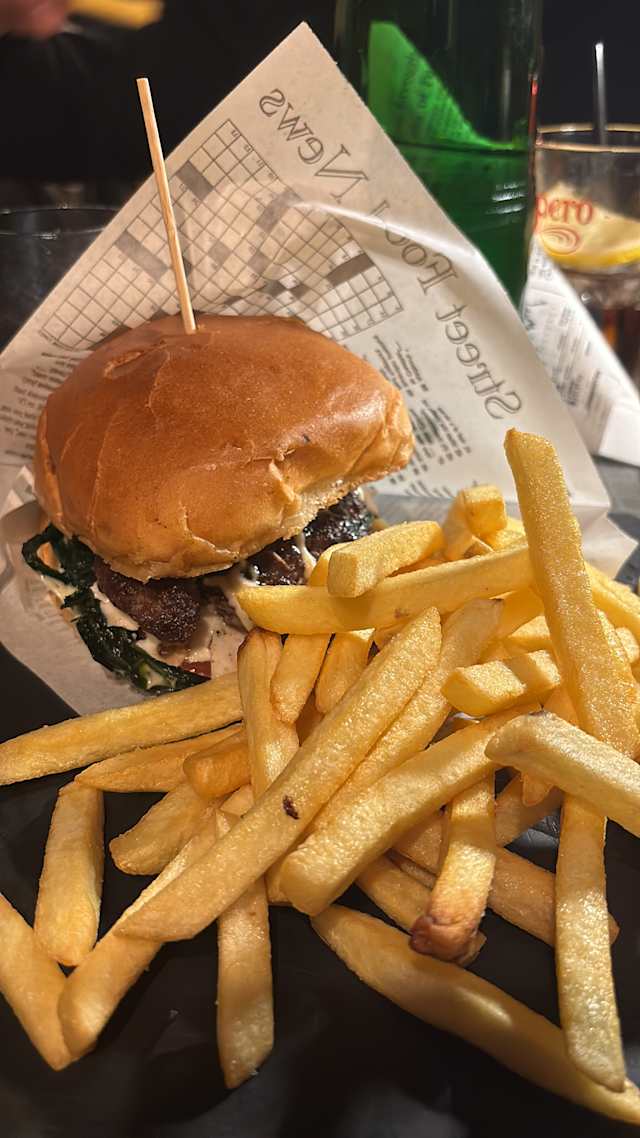 Burger di manzo fatto a mano di 180gr, cicoria, maionese fatta in casa al guanciale, scaglie di pecorino romano, guanciale croccante e pomodoro. Accompagnato da patatine fritte e salse fatte in casa.