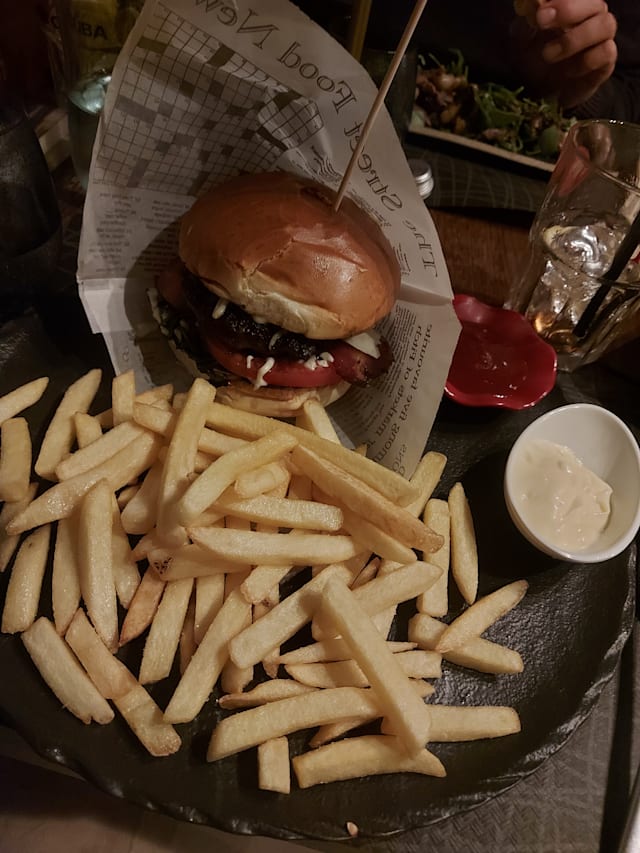 Burger di manzo fatto a mano di 180gr, guanciale croccante, cheddar, salsa smokey, cipolla rossa agrodolce, insalata e pomodoro. Accompagnato da patatine fritte e salse fatte in casa.