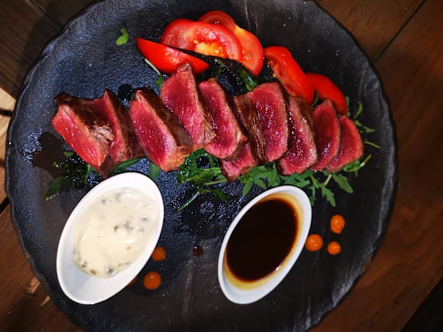 Tagliata di manzo del gruppo galli, servita con salse e dressing selezionati e preparati dallo chef