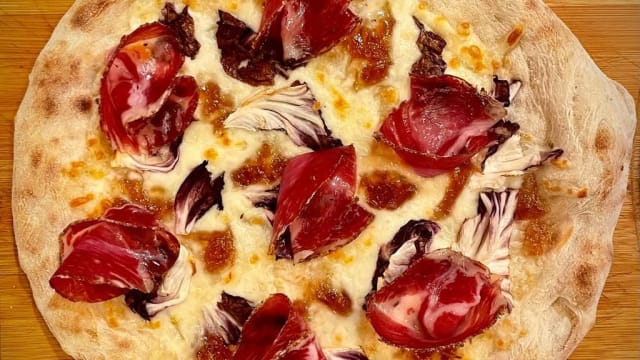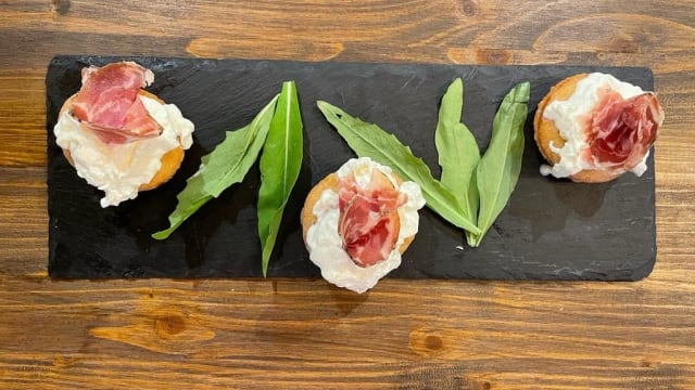Olio, sale, pomodorino ciliegino, mozzarella fiordilatte prosciutto crudo don romeo 24 mesi levoni, rucola, scaglie di grana