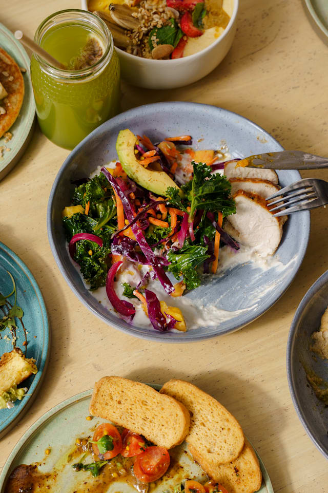 Logurte grego com nosso blend immunity, creme de pistachio e amêndoa, fruta da época, granola de laranja e calda de laranja