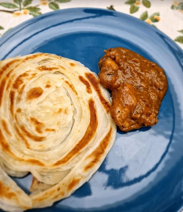 Flaky, layered south indian parota served with a flavorful curry for a perfect combination