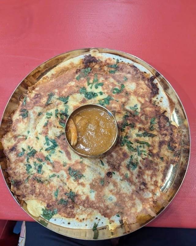 A soft dosa topped with a perfectly cooked egg, offering a protein-packed dish that’s nutritious and tasty.