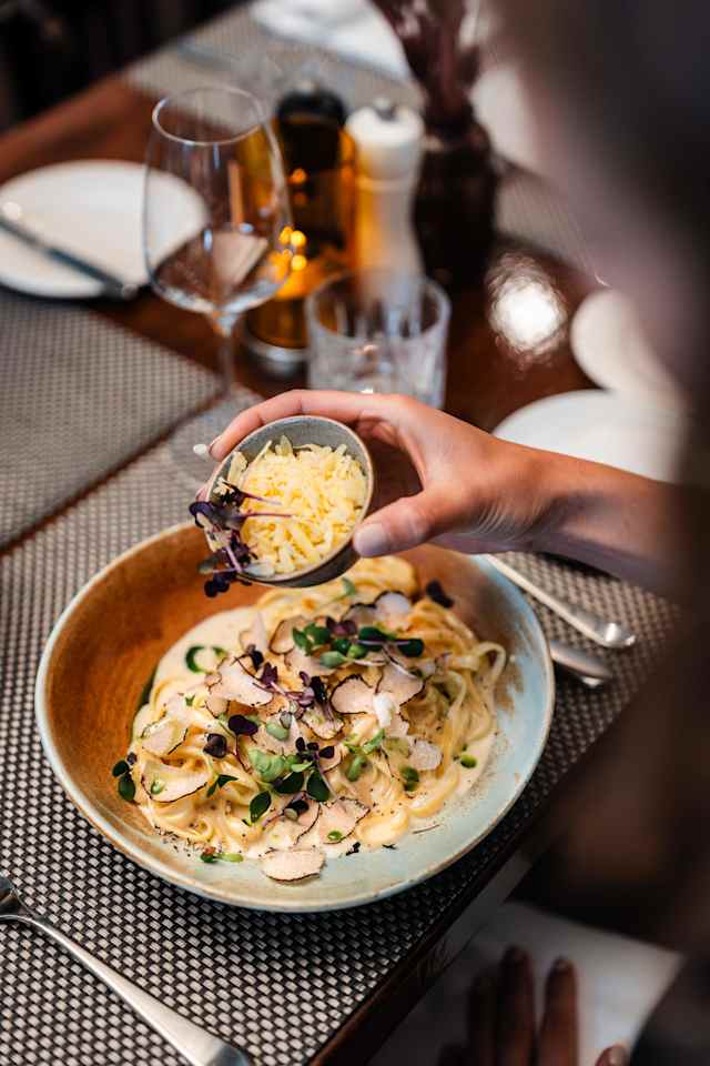 - Trüffelschaum, frisch gehobelter schwarzer Trüffel, alter Comté