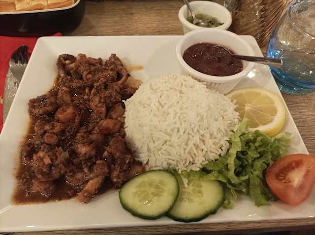 - Fricassé de chatrou (poulpe) servi avec du riz et des haricots rouges