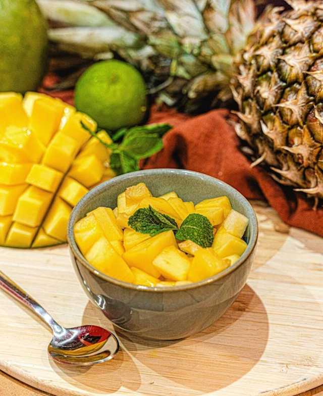 - Salade de fruits exotiques composée généralement de mangue et d'ananas parfumée de menthe et coriandre.