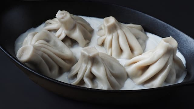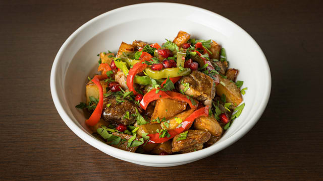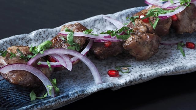 Carne de cerdo, bouquet de hierbas, cebolla, salsa tkemali/satsebeli.