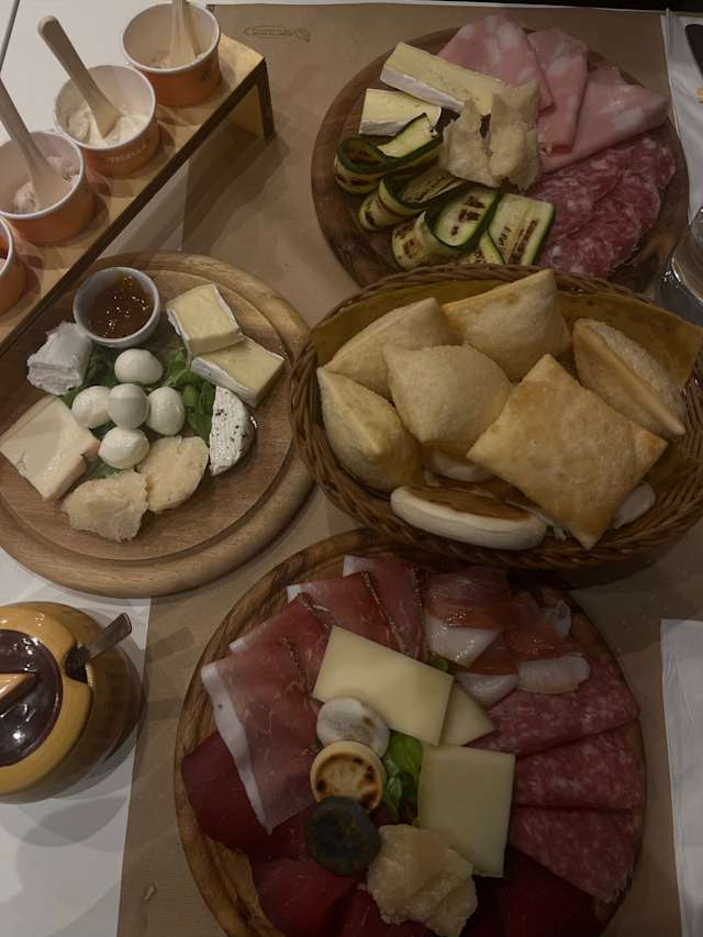 - Tagliere composto da prodotti considerati eccellenze del territorio Parmense: Prosciutto crudo di parma 22 mesi dop, culatto, mortodella bonfatti (slow food), salame liberato (senza additivi chimici),salome mariola (slow food), parmigiano reggiano dop vacche rosse24 mesi, parmigiano reggiano dop 24 mesi. Composto di pere e miele di costogno.