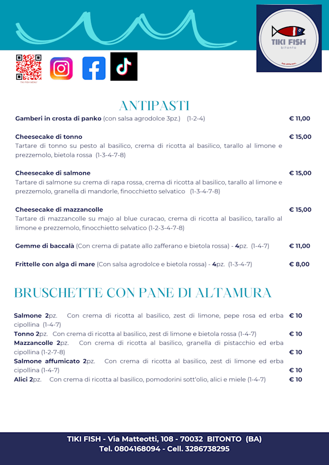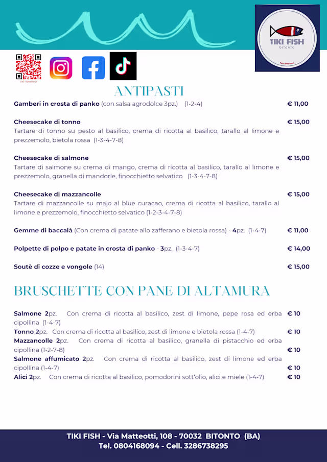 We had a wonderful time at the dinner ar Tiki Fish! The food was delicious, the owner and the waiters were really nice and the cocktails were very strong, which was a good thing for sure! They even helped to get rid of the stain on a dress of one of us! If we ever come back to Bitonto, we’ll make sure to pay a visit in this place!