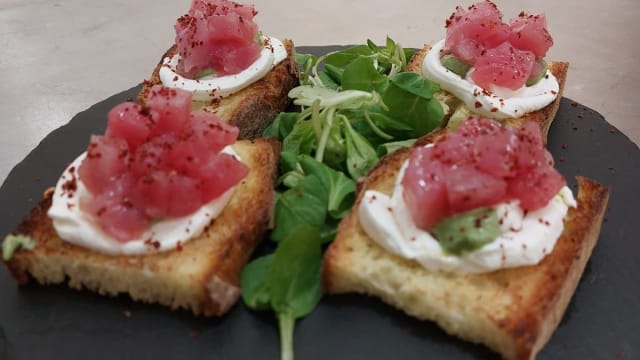 Con tartare di tonno, condita con olio EVO e limone, su crema al basilico, tarallo sbriciolato aromatizzato con zest di limone e prezzemolo, crema di ricotta profumata al basilico e polvere di peperone crusco