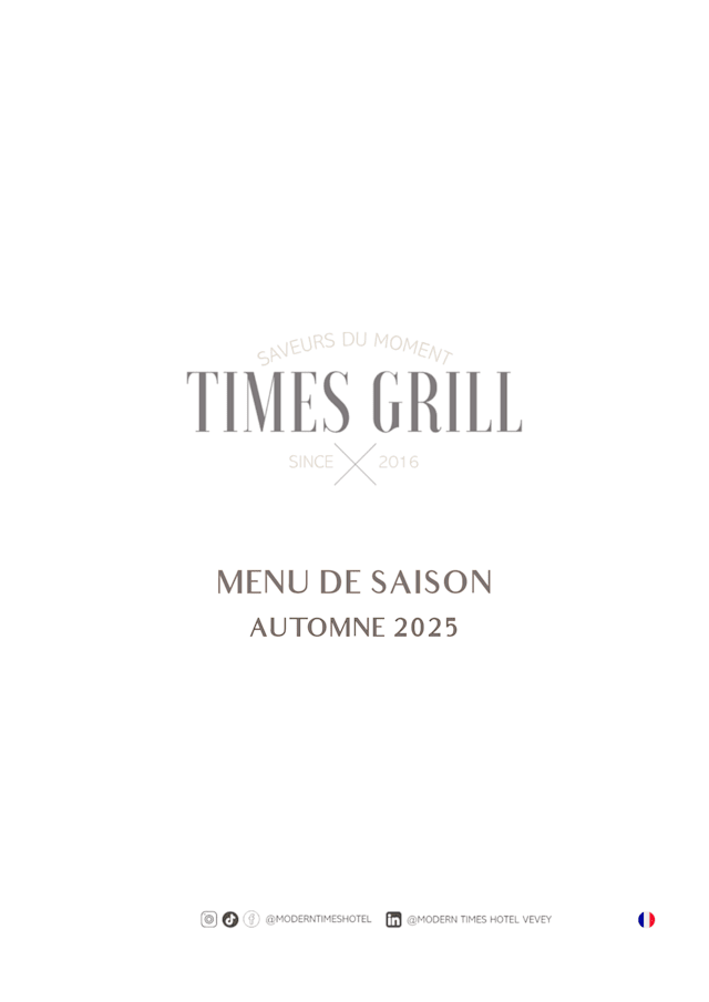 GRILLADE – Amoureux des grillades ? Bienvenue au Times Grill ! Vous succomberez au plaisir de goûter de remarquables pièces de viandes maturées et préparées en show grill. INTEMPOREL – Le restaurant Times Grill est situé dans le Modern Times Hôtel dédié au personnage de Charlie Chaplin vous trans...