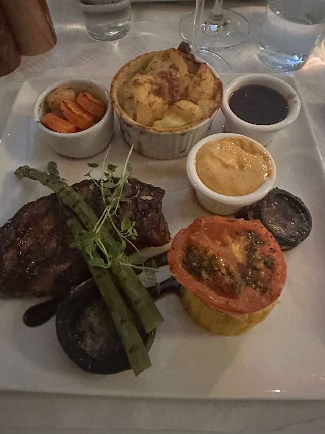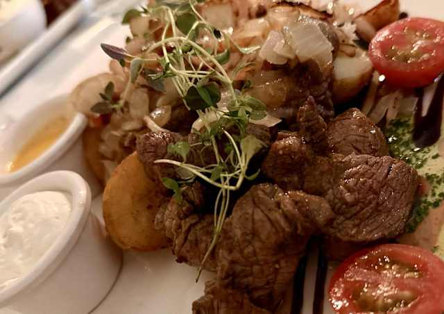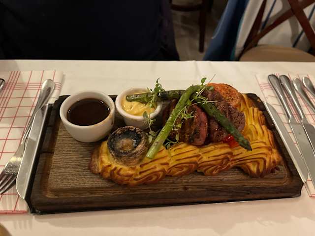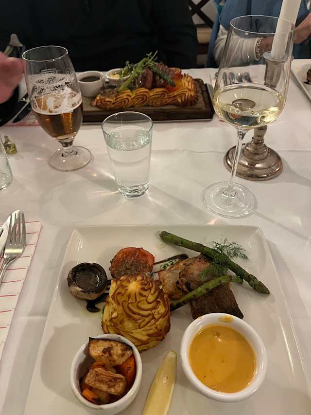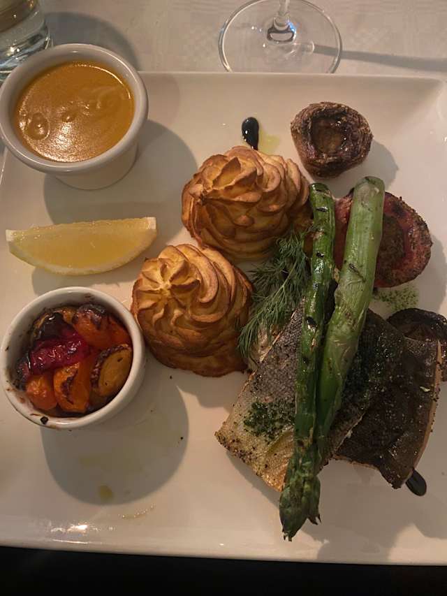 6.5/10Nice environment, not entirely professional service, very average food. On the plate it looked a bit like a mess, from mushrooms to asparagus and grilled tomatoes to stewed vegetables and you could hardly see the main course - fish.