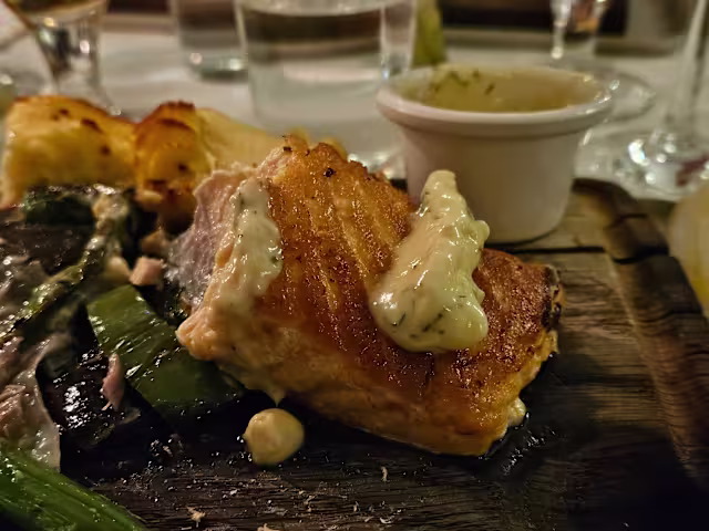 - Laxfilé, sparris, räkor, grillad tomat, sauterade grönsaker, potatismos samt hollandaisesås.