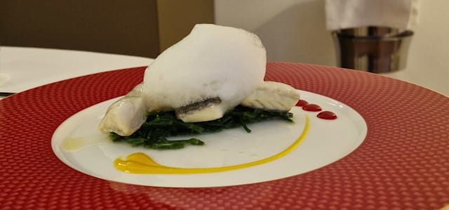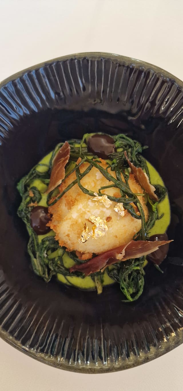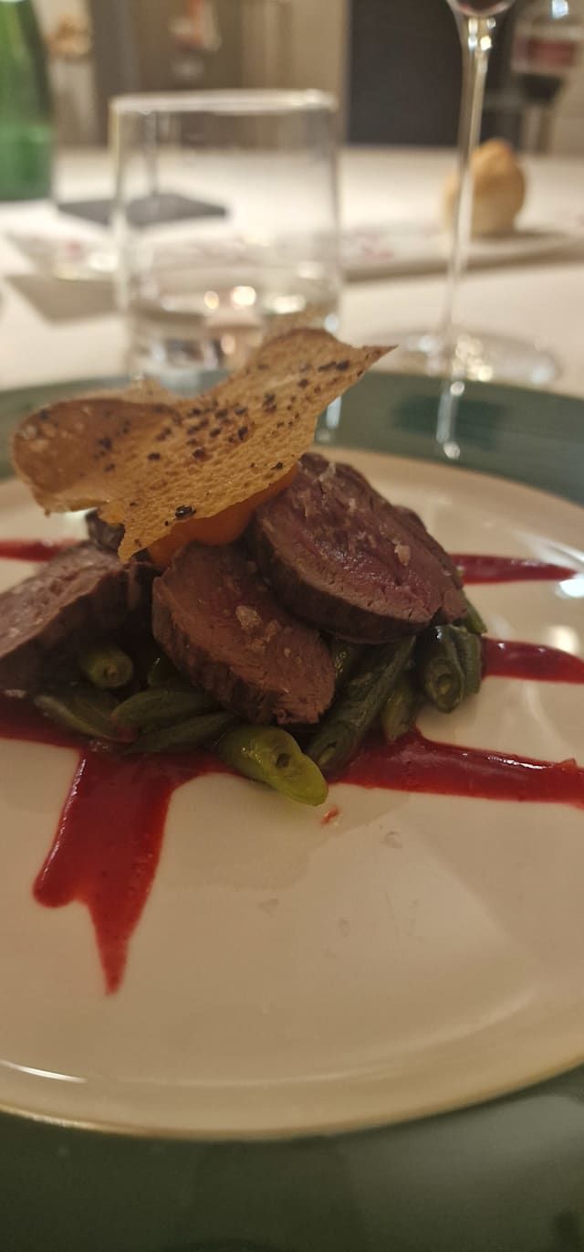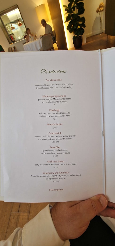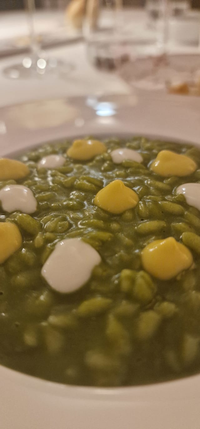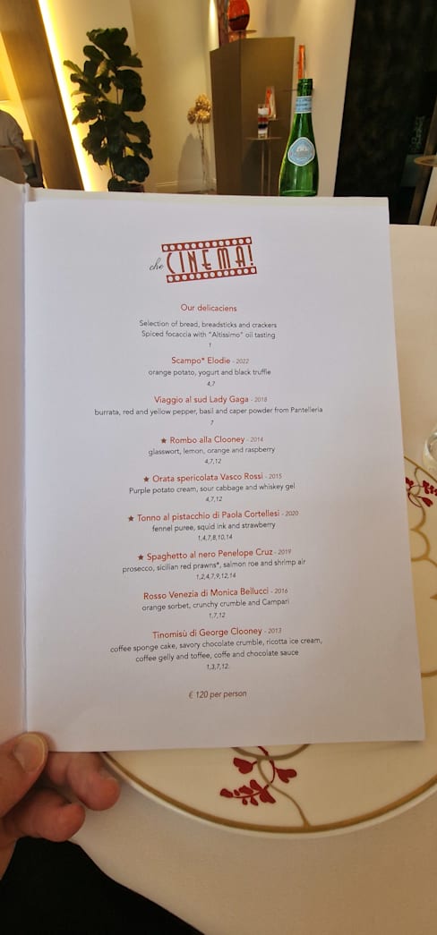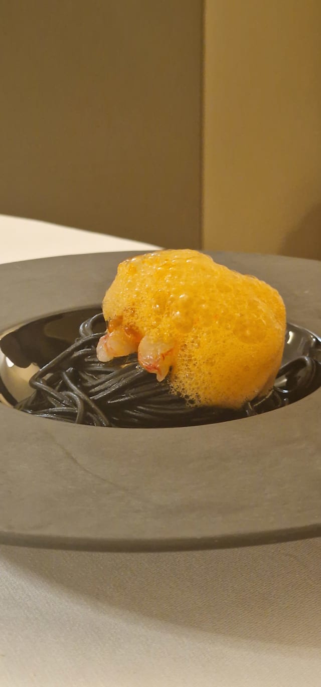 10/10+7We discovered this restaurant thanks to its 5-star Google rating. Located in the luxurious Hotel Soligo, it impresses with stylish interiors and local art. We were lucky to try two menus: my husband chose “Tradizione” and I had “Che Cinema!”. The service team, led by Paola with sommelier Stefano, created the perfect setting. Highlights were my “Rombo alla Clooney” – turbot cooked in vodka and prosecco with samphire salt – and “Spaghetto al nero Penelope Cruz” with perfectly al dente spaghetti and red prawns. My husband especially loved the fried egg with pea foam, gold leaf, and monk’s beard, as well as “Mama’s Risotto”. His deer fillet with green beans and smoked carrots was equally superb. Chef Stefano deserves the highest praise, and pastry chef Giusi’s desserts were an exquisite finale. A heartfelt thank you to the entire team for giving us such a wonderful evening.
