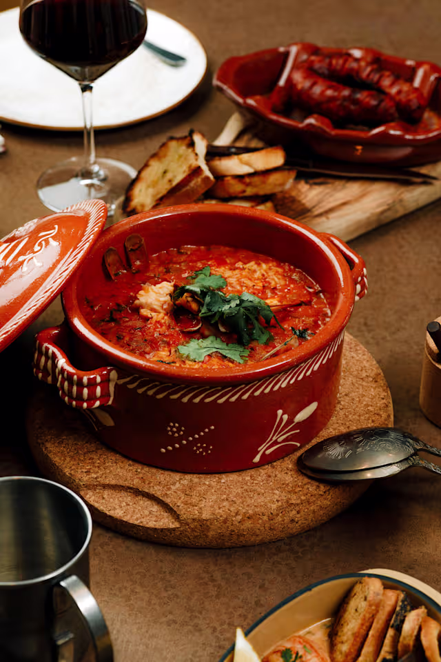 - Peixe e marisco suado na cataplana, servido com batata cozida, cebola e pimentos.