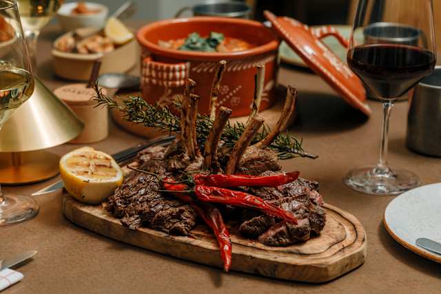 - Tenro carré de borrego de origem controlada, marinado em alho e vinho branco, grelhado a seu gosto acompanhado com molho de vinho do porto e hortelã