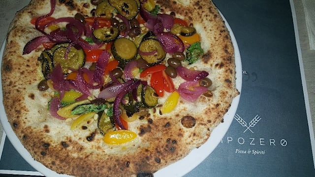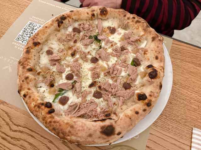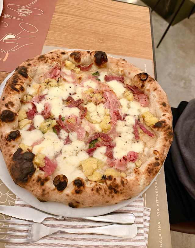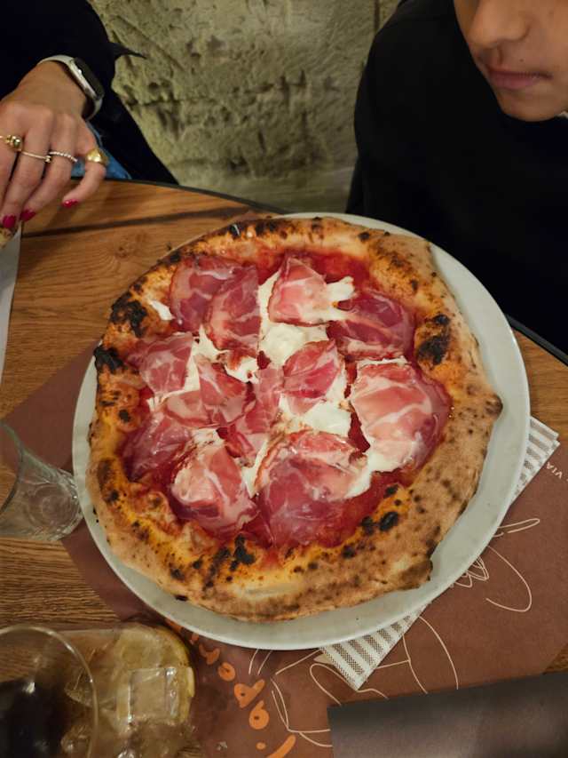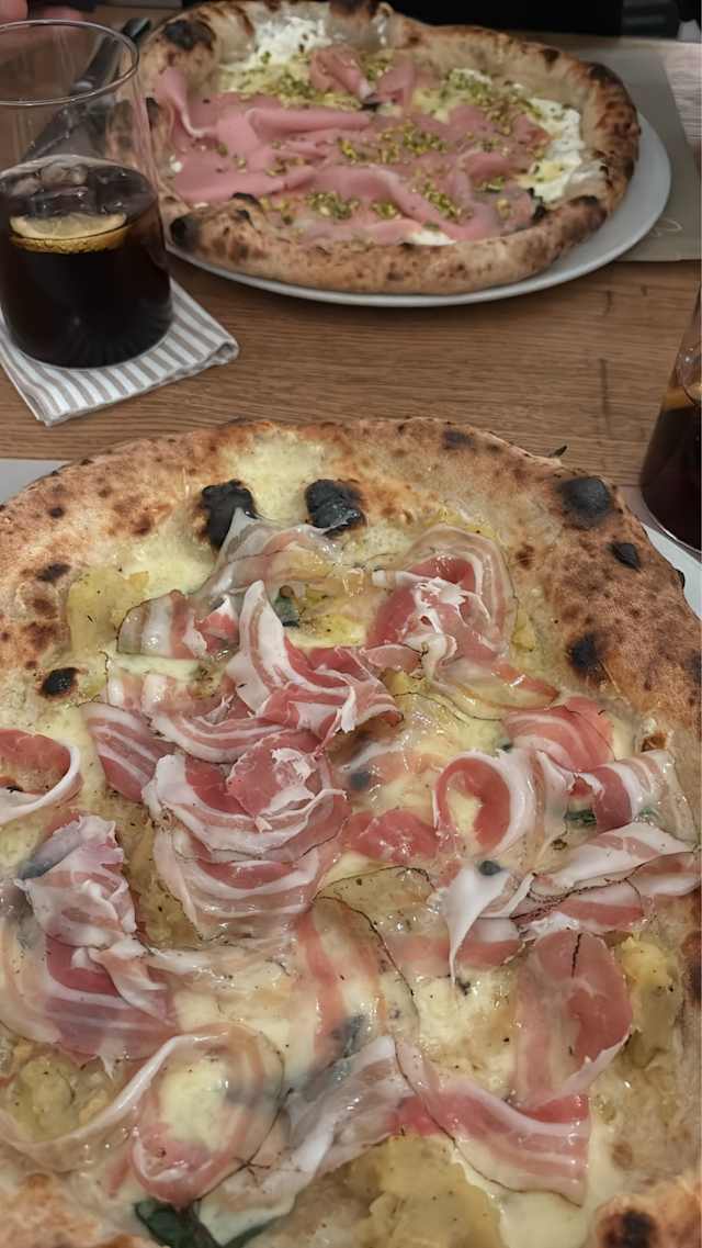 Base doppia cottura, ricotta locale, zucchine fritte, pancetta al pepe, provola affumicata, basilico, olio evo