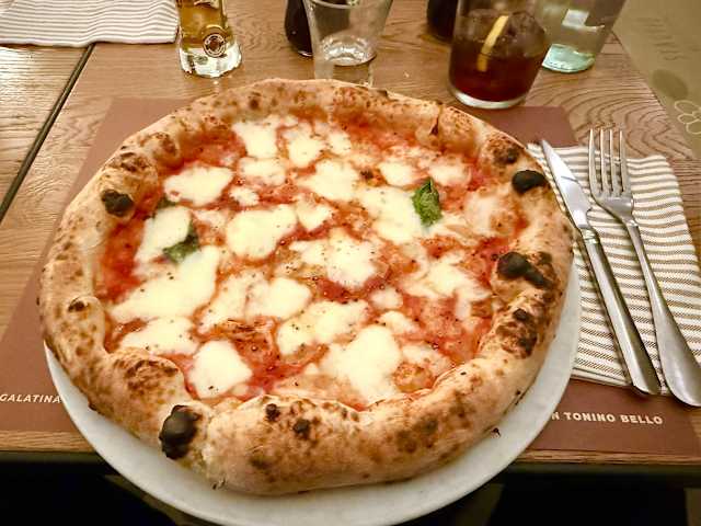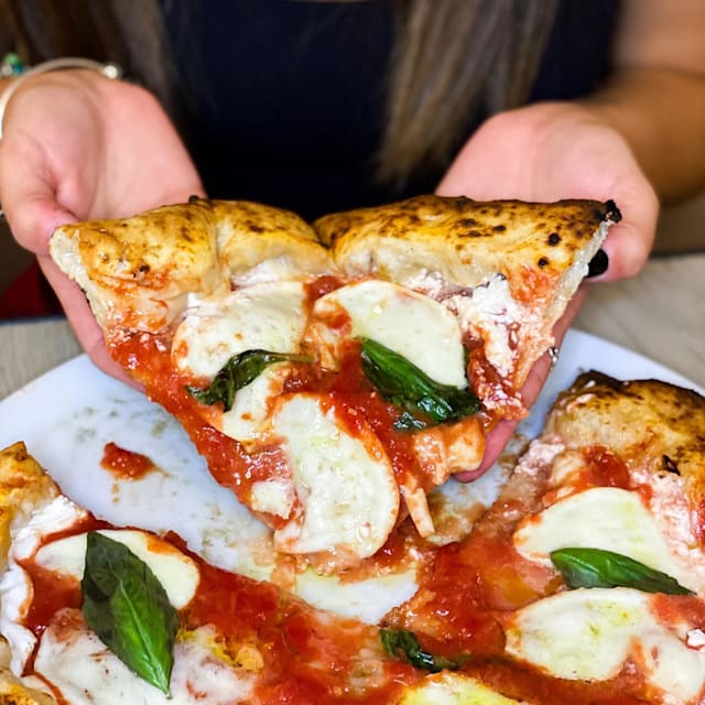 Pomodoro pelato giallo, fior di latte campano, guanciale , pecorino romano, pepe fresco, basilico fresco, olio evo