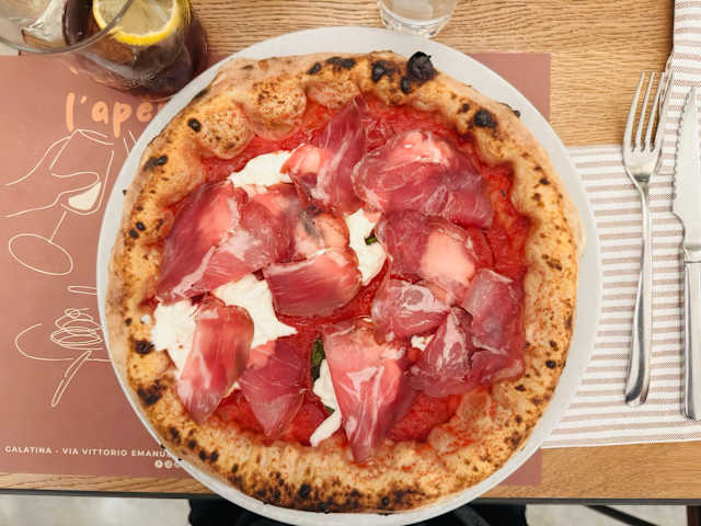 Pomodorini freschi, fior di latte campano, prosciutto crudo san daniele 24 mesi salumificio villani, parmigiano reggiano 24 mesi, olio extravergine d’oliva fruttato medio, basilico fresco