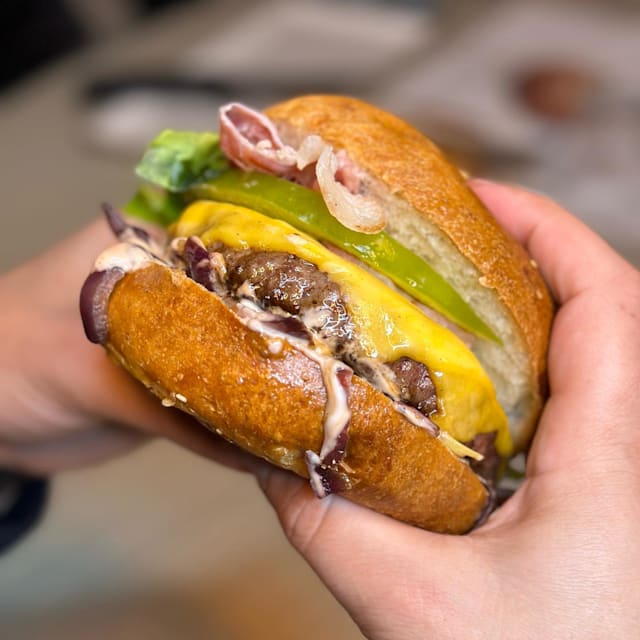 Bun 100% artigianale staglio panificati, 200 gr hamburger 100% artigianale di scottona, bacon, vintage cheddar, pomodoro, lattuga, cipolla caramellata, ketchup, patatine fritte