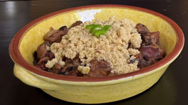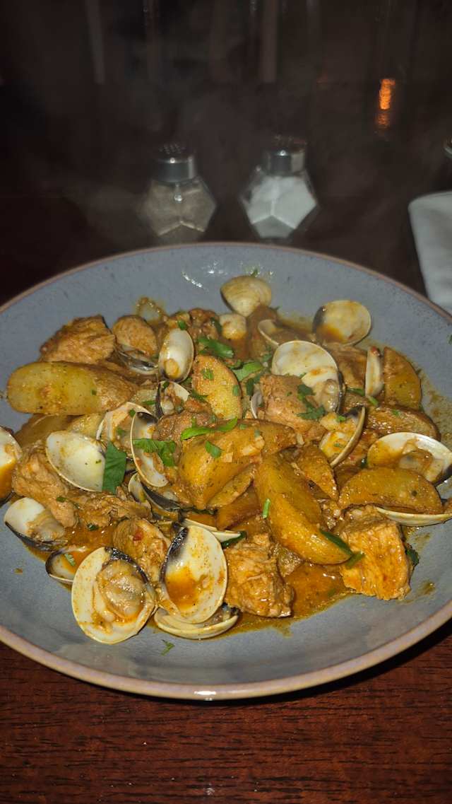 - Barriga de porco alentejana acompanhada de amêijoas locais em caldo de vinho branco e coentro