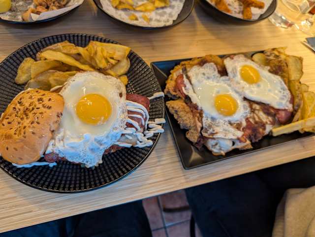 - Huevos rotos con chorizo, queso brie y salsa brava.