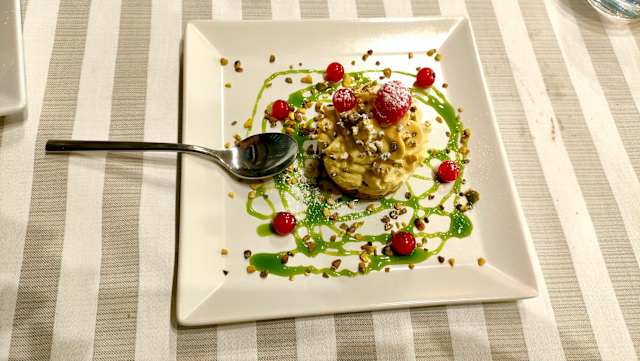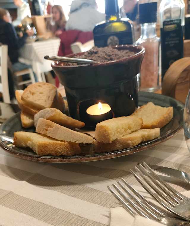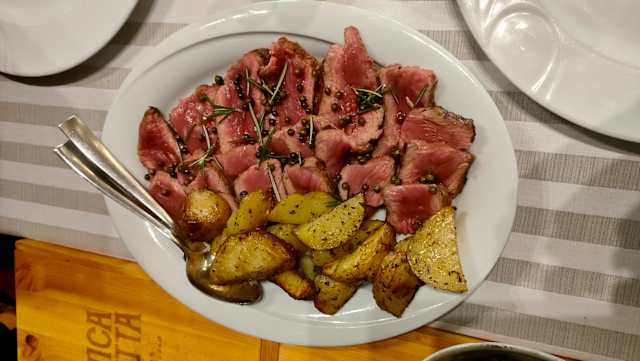 - Antipasto tirovino (misto di salumi e coccetto di crostini neri), tagliata al pepe verde, contorno, dessert