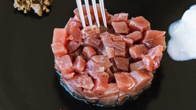 Tonno, avocado, salsa speciale, ricoperto di tonno, salsa speciale, croccante