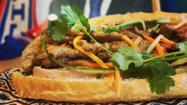 Panino con manzo marinato, patè, mayo, rapa bianca o carote, coriandolo