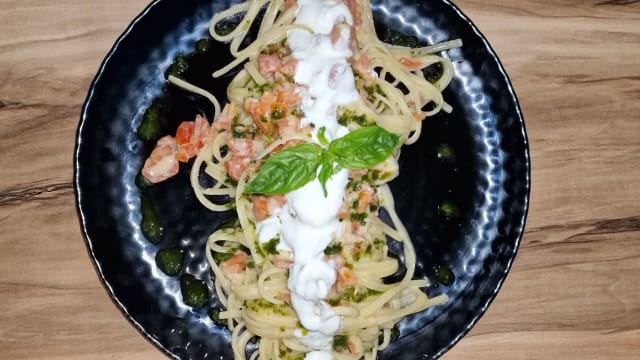 - Pesto di ciliegino, aglio, burrata, crema di basilico