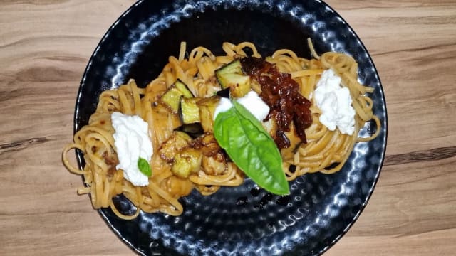 - Salsa di pomodoro, melanzane fritte, ricotta salata, crema di basilico, olio evo