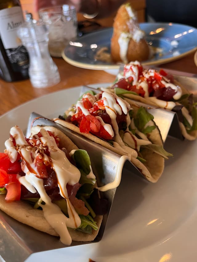 8.5/10Good was tasty and very large potions. Pizza is definitely share size. Ordered the artichoke one and flavor was terrific however it was very ‘wet’ so the middle was soggy. Needed fork and knife to eat as could not pick up. Wine selection nice. Gorgeous sea view.