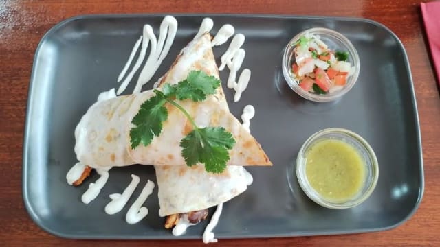 Tortilla recheada com queijo, dobrada e acompanhada de pico de gallo e salsa verde