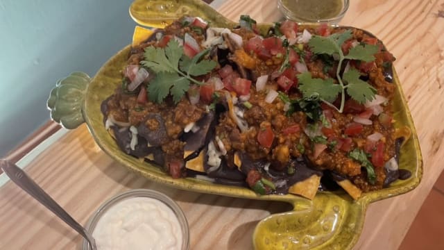 Tortilha frita, coberta com feijão, chili con carne, queijo, pico de gallo e servida com molho da casa