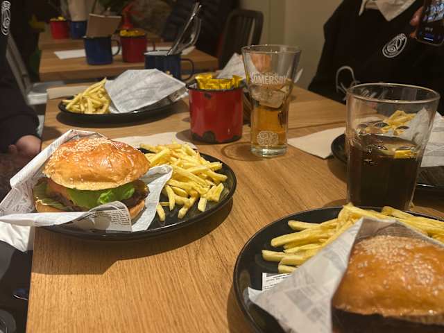 - Carne de vaca, queijo cheddar, alface, tomate e molho cocktail